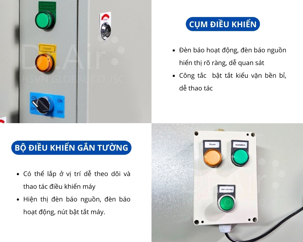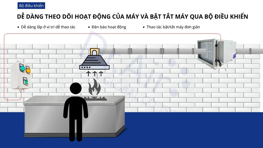 - Bảng điều khiển gắn tường, có các chức năng đèn báo nguồn, đèn báo hoạt động, bật/tắt máy lọc tĩnh điện.