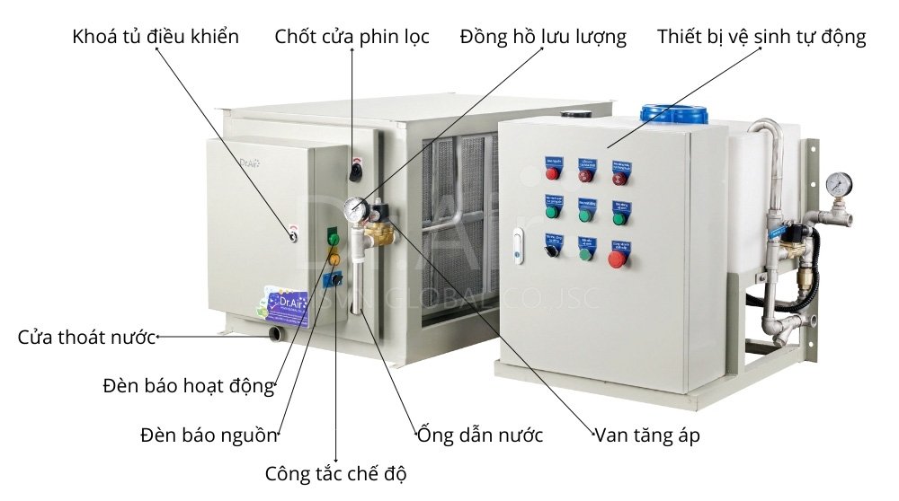 Máy lọc tĩnh điện Dr.Air KTA là một thiết bị chuyên dụng, được thiết kế để loại bỏ các hạt bụi, khói và chất ô nhiễm khác từ không khí thông qua quá trình tĩnh điện. Cấu trúc chi tiết của máy bao gồm các bộ phận chính sau: